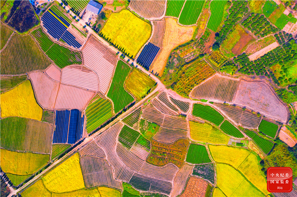 一片绿、一片红、一片金黄……宁波市宁海县茶院乡平遥村丰收的农田五光十色。(宁波市宁海县纪委监委供 仇奕尹 摄)
