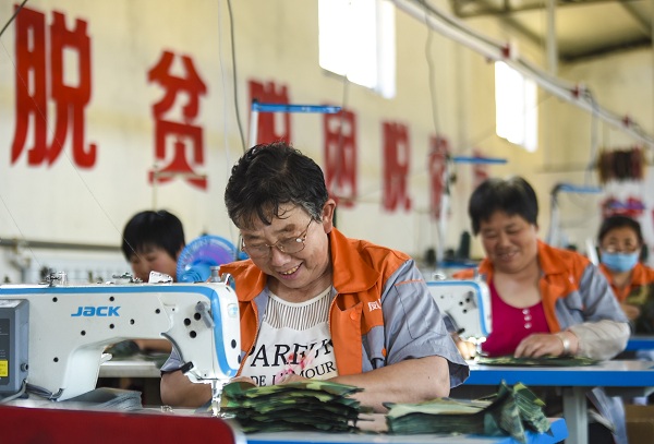 河北省深州市在推进产业扶贫的过程中注重激发内生动力,通过电商扶贫、扶贫车间、特色种植养殖等多种形式,提升自我“造血”功能,提高贫困群众受益度。图为该市高古庄镇凤凰池村村民在扶贫车间做缝纫工作。新华社记者 李晓果 摄