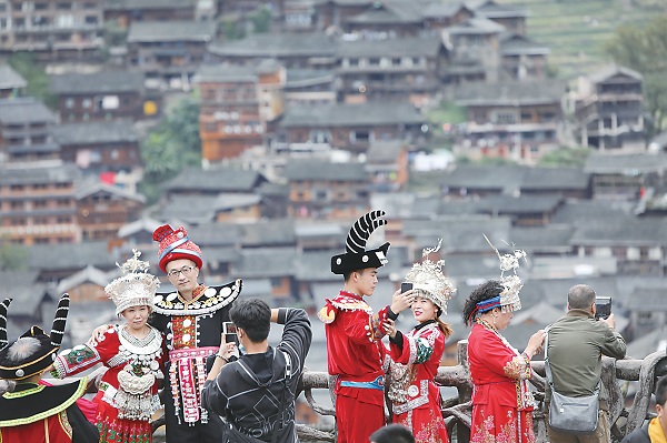 近年来,贵州省雷山县不断推动高铁资源和旅游景区深度融合,方便各地游客前来体验苗族风情,观赏苗寨美景,为古老苗寨的乡村振兴注入活力。图为今年国庆假期,游客穿着民族服装在该县西江千户苗寨观景台拍照留念。新华社发(林世康 摄)