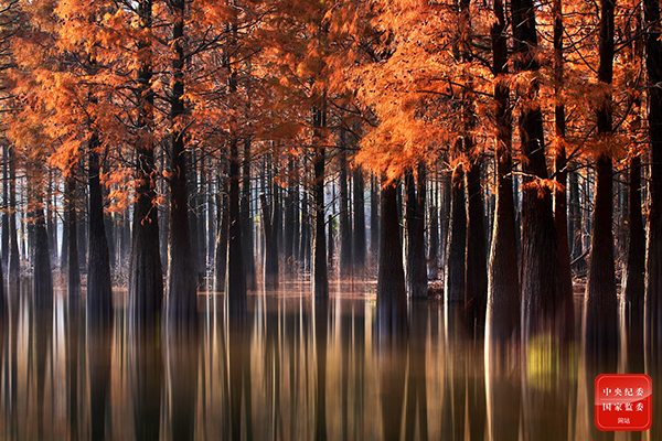 秋意渐浓,浙江省绍兴市上虞区上浦镇石井水库的水杉换上了秋装。一抱粗的树干深深扎进水面下,像站岗放哨的战士,无声地守卫着这一片湿地。(浙江省绍兴市上虞区纪委监委供 马禾乃 摄)