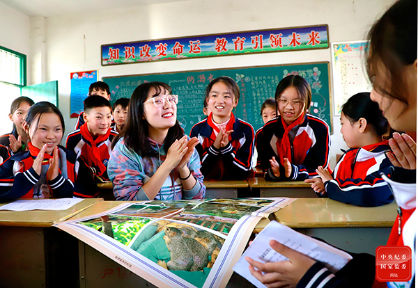 在江西省宜黄县,越来越多的大学生扎根基层教书育人,为山区教育注入新鲜血液,用知识和爱心点亮留守儿童的希望。图为该县梨溪镇中心小学支教的大学生徐蕴,在课堂上向同学们讲授模仿动物发声的技巧,同学们饶有兴致地边学边做,生动有趣的课堂上欢声笑语不断。(江西省宜黄县纪委监委供 章英全 摄)