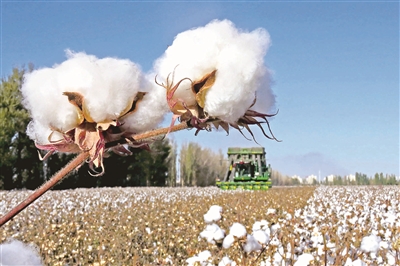 新疆,是一片棉花生长的沃土。每至金秋,天山南北万顷“棉海”进入采收旺季,雪白饱满的棉团如白头浪层层滚来,直接天际。棉田里,采棉机将朵朵棉絮卷成形同巨蛋的棉包,一派丰收景象。