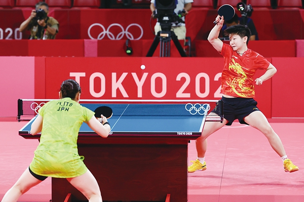 7月29日,在东京奥运会乒乓球女单半决赛中,孙颖莎(上)4比0淘汰日本选手伊藤美诚。(图片来源:视觉中国)
