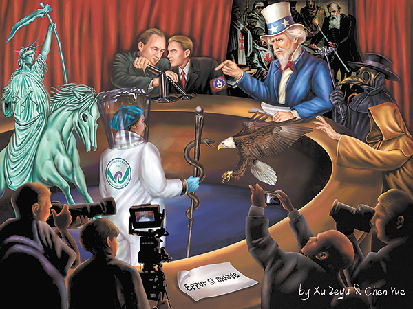 漫画以美国国会听证会为场景,审判席上象征着美国的“山姆大叔”手拿刚出炉的所谓溯源报告,对象征着科学精神的武汉病毒研究所的科研人员横加指责。而象征美国政府的白头海雕,正扑向科研人员手中象征着医护和健康的蛇形手杖。画面右上方一幅名为“被审判的伽利略”的油画以及下方伽利略的一句名言“Eppur si muove”(意为“地球仍然在转啊”),点明了这幅漫画的主题——美国政府对科学精神的打压,正如欧洲宗教裁判所对伽利略的审判一样荒谬可笑。