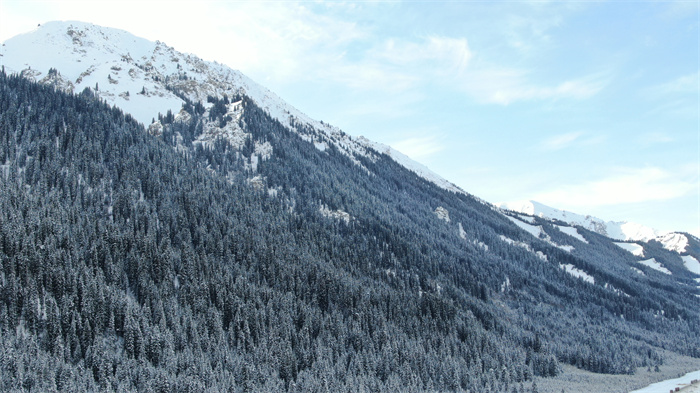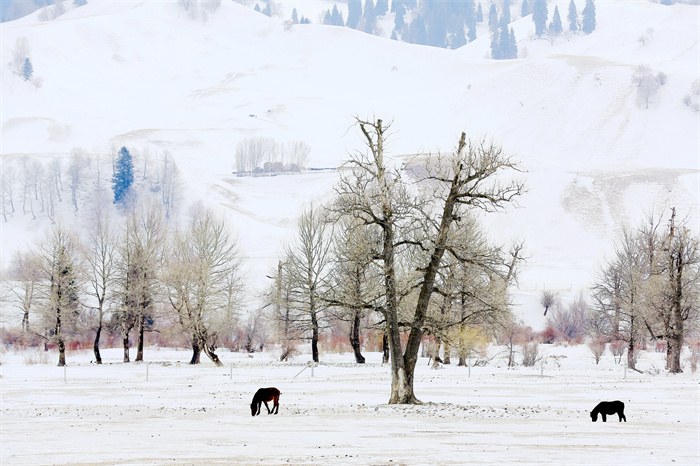 冬日的巩乃斯披上了素白的银装,白的雪花和晶莹剔透的冰晶覆盖着树木和山林,仿佛进入童话世界一般。(和静县纪委监委 巴音达来 摄)
