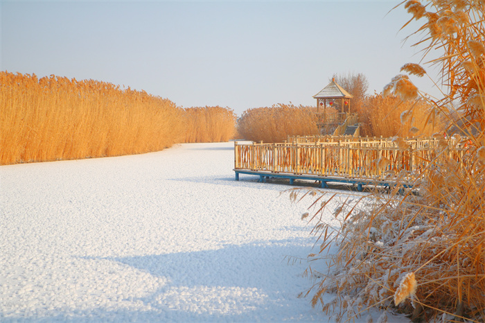 年关的博斯腾湖已满被冰雪覆盖,小亭的静谧和芦苇荡的沙沙声替代了夏日的烟波浩渺、涛声入耳。(博湖县纪委监委 王陆斌 摄)