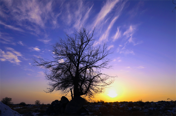 夕阳的余晖映照着天边的云彩,幻化为火红的晚霞,洒落在天山脚下的老榆树上,宛若梦幻。(和硕县纪委监委 贾洪明 摄)
