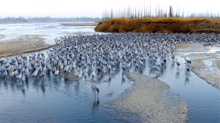 寒冬腊月天的且末县达西湖湖畔,成群的国家二级保护动物灰鹤在此栖息翩跹,成为冬日里独特的风景。(且末县纪委监委 苏鑫 摄)
