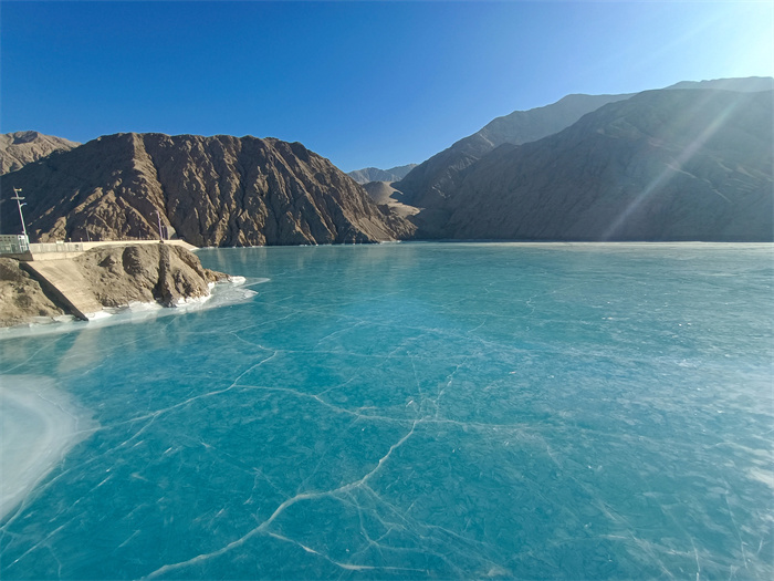 坚冰深处春水生,昆仑山脚下的米兰河水库,在阳光照耀下与雄壮的山峰携手呈现出一幅壮丽的画卷。(若羌县纪委监委 张达 摄)