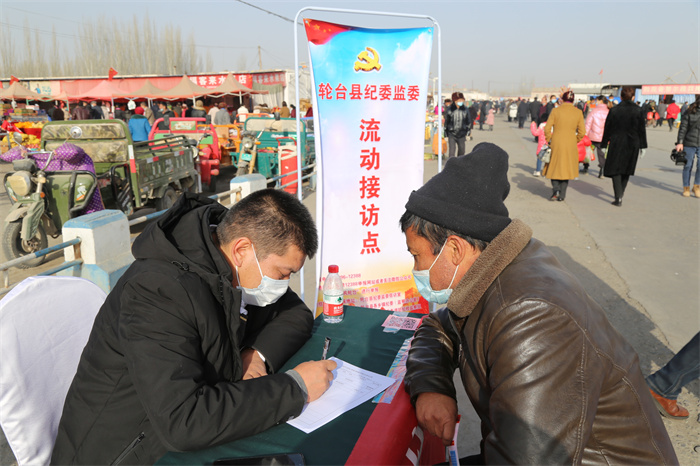 轮台县纪委监委聚焦民生领域损害群众利益问题开展“流动接访”活动,走进农贸市场,耐心接待来访群众,为群众答疑解惑。(张越 摄)