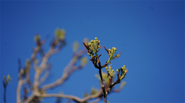 蓓蕾枝梢血点乾,粉红腮颊露春寒。