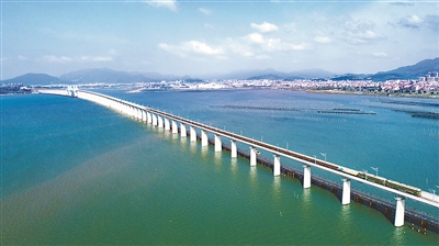 4月15日,新建福厦铁路湄洲湾跨海大桥顺利铺轨。图为建设中的新建福厦铁路湄洲湾跨海大桥。 新华社发(周义 摄)