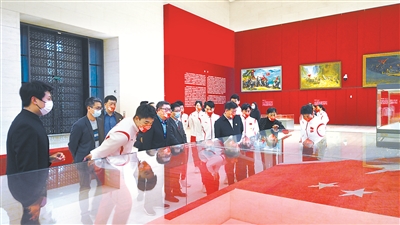 4月18日下午,中国冰雪健儿参观中国国家博物馆“复兴之路”展览。图为国家体育总局冬季运动管理中心有关负责人与运动员、教练员参观中华人民共和国第一面五星红旗。瞿芃 摄