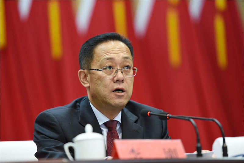 12 月22 日,在巴音郭楞宾馆巴音会堂,州党委书记李刚在自治州党委十届五次全体(扩大)会议上讲话。巴音郭楞日报记者 杨坤 摄