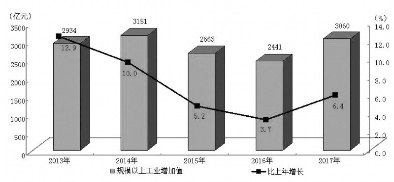 全年全部工业增加值3229.09亿元,比上年增长6.1%。规模以上工业增加值3059.57亿元,增长6.4%。在规模以上工业中,按经济类型划分,国有控股企业增加值1924.05亿元,增长8.4%;集体企业增加值2.27亿元,增长24.1%;股份制企业增加值2800.39亿元,增长5.1%;外商及港澳台商投资企业增加值71.38亿元,增长11.4%;私营企业增加值452.53亿元,增长1.8%。按工业三大门类划分,采矿业完成增加值848.18亿元,增长4.3%;制造业增加值1749.69亿元,增长4.5%;电力、热力、燃气及水生产和供应业增加值461.70亿元,增长17.7%。按轻重工业划分,轻工业增加值377.58亿元,增速为零;重工业增加值2681.99亿元,增长7.5%。按石油、非石油行业划分,石油工业增加值1087.86亿元,增长5.5%;非石油工业增加值1971.71亿元,增长7.0%。