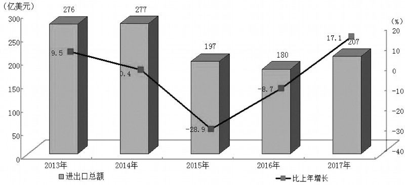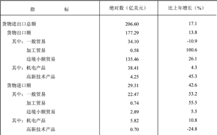 全年货物进出口总额206.60亿美元,比上年增长17.1%。其中,出口177.29亿美元,增长13.8%;进口29.31亿美元,增长42.6%。货物进出口差额(出口减进口)147.98亿美元,比上年增加9.36亿美元。