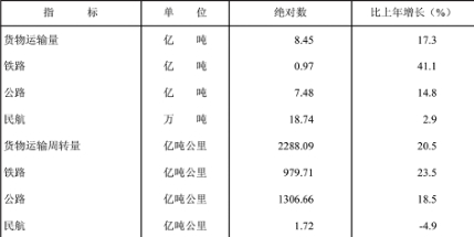 全年货物运输量8.45亿吨,比上年增长17.3%。货物运输周转量2288.09亿吨公里,增长20.5%。