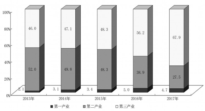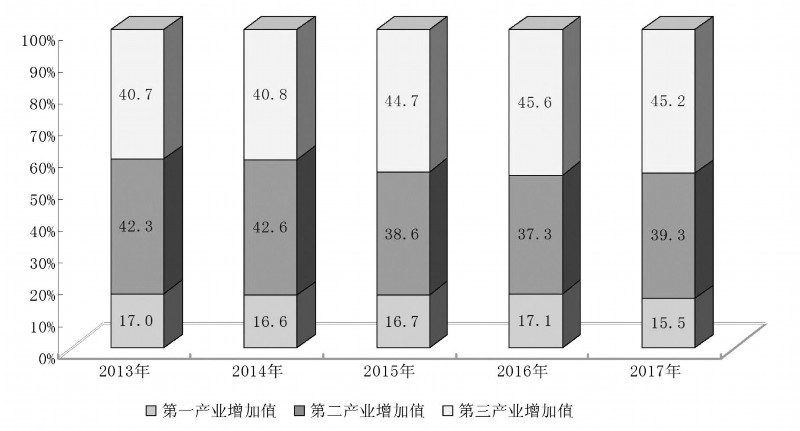 2013—2017年全区三次产业增加值占地区生产总值比重