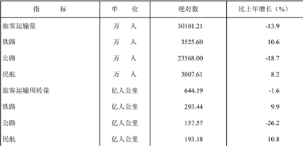 全年旅客运输量30101.21万人,比上年下降13.9%。旅客运输周转量644.19亿人公里,下降1.6%。