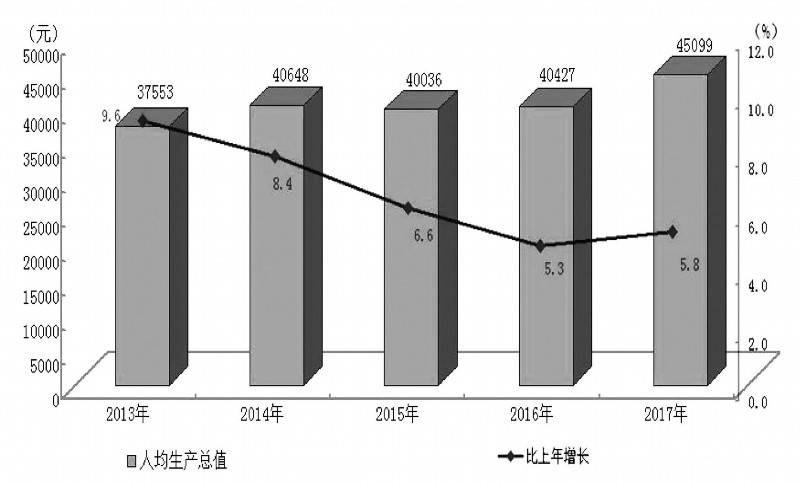 初步核算,全年地区生产总值(GDP)10920.09亿元,比上年增长7.6%。其中,第一产业增加值1691.63亿元,增长5.6%;第二产业增加值4291.95亿元,增长5.9%;第三产业增加值4936.51亿元,增长9.8%。第一产业增加值占地区生产总值的比重为15.5%,第二产业增加值比重为39.3%,第三产业增加值比重为45.2%,第三产业成为拉动经济增长的第一动力。全年人均生产总值45099元,比上年增长5.8%。