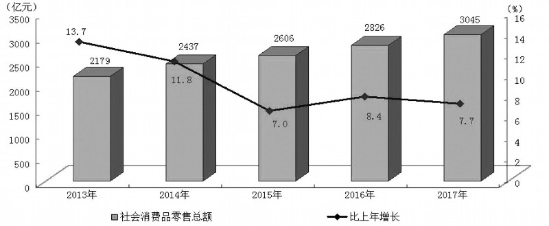 全年社会消费品零售总额3044.58亿元,比上年增长7.7%。按经营地划分,城镇消费品零售额2760.64亿元,增长7.5%;乡村消费品零售额283.94亿元,增长10.6%。按消费形态划分,商品零售额2637.97亿元,增长7.3%;餐饮收入额406.61亿元,增长10.9%。按规模划分,限额以上单位消费品零售额1314.39亿元,增长5.2%;限额以下单位消费品零售额1730.19亿元,增长9.8%。