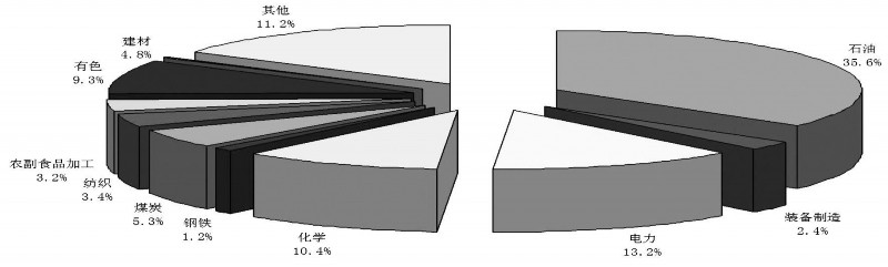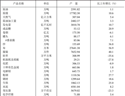 在自治区重点监测的十大产业中,石油工业增加值1087.86亿元,增长5.5%;有色工业285.67亿元,增长2.1%;电力工业403.82亿元,增长19.7%;化学工业318.36亿元,增长12.9%;钢铁工业35.25亿元,增长22.6%;建材工业147.82亿元,增长8.5%;煤炭工业163.25亿元,增长7.0%;纺织工业104.99亿元,增长19.8%;农副食品加工工业96.69亿元,下降1.1%;装备制造工业73.00亿元,下降20.0%。六大高耗能行业增加值增长11.1%,占规模以上工业增加值的比重为55.0%。