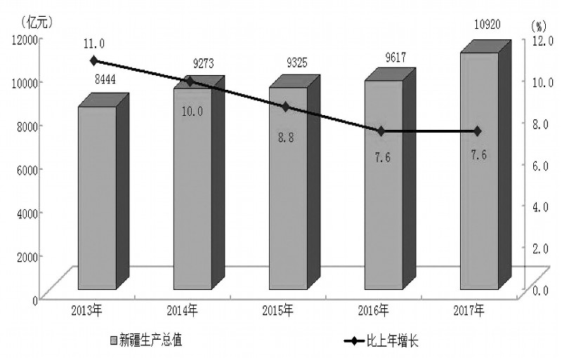 2017年,在以习近平同志为核心的党中央坚强领导下,自治区党委、人民政府团结带领全区各族人民,以习近平新时代中国特色社会主义思想为指导,深入贯彻落实党的十九大精神,主动适应经济进入新时代的要求,聚焦总目标,打好组合拳,坚持稳中求进工作总基调,坚定不移贯彻落实新发展理念,坚持以提高发展质量和效益为中心,以供给侧结构性改革为主线,统筹推进稳增长、促改革、调结构、惠民生、防风险各项工作,经济社会呈现提质增效、稳中向好态势,转型发展加快推进,民生保障持续增强,社会事业全面进步,生态环境显著改善,为决胜全面建成小康社会奠定坚实的基础。