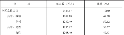 年末全区常住人口2444.67万人,比上年末增加46.59万人,其中,城镇常住人口1207.18万人,占总人口比重(常住人口城镇化率)为49.38%,比上年末提高1.03个百分点。全年出生率为15.88‰;死亡率为4.48‰;自然增长率为11.40‰。