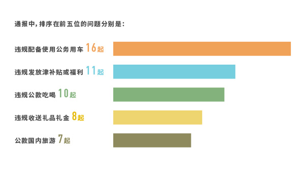 通报中,排序在前五位的问题分别是:违规配备使用公务用车(16起)、违规发放津补贴或福利(11起)、违规公款吃喝(10起)、违规收送礼品礼金(8起)、公款国内旅游(7起)。可见,违规配备使用公务用车等老问题依然突出,同时,一些“四风”问题改头换面、潜入地下,呈现出由明转暗、逃避监管等隐形变异现象。有的以虚假支出公款购买高档酒水,有的不吃公款吃老板,有的化整为零操办婚丧喜庆,有的违规占用下属单位或管理服务对象车辆。比如,北京建工土木工程有限公司原五棵松地下停车场工程项目经理王先堂,向合作分包单位员工无偿借用越野车,用于个人工作及生活。