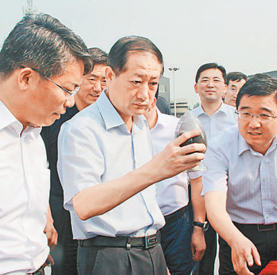 刘钦海(前左二)在泰安新环能清洁能源有限公司交流产品创新。(段秀川 摄)