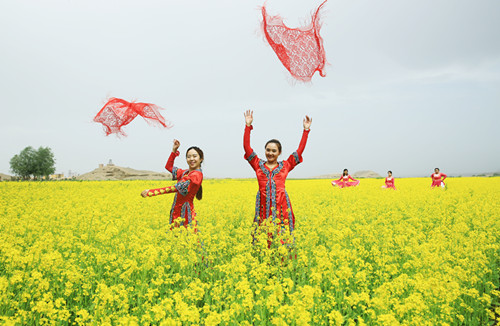 游人在盛开的油菜花地里尽情的欢乐。 拍摄者:董基春