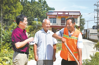 河南省汝南县纪检监察干部(左)向群众了解低保金发放情况。 付华 摄