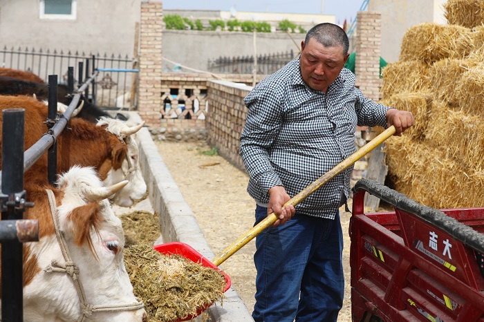 “以前我是靠游牧生活,日子过得很不好。眼看别人家都富起来了,自己还是贫困户,总觉得很臊面子,我早就想改变,但不知道该怎么办。后来村干部动员我们搬迁山下,发展庭院经济,我就率先从山上搬迁到了山下的牧民定居点——阿牧楞小区。一年后,我就享受到了政府给的扶贫母牛,这头牛生了一头牛犊,给我带来3000元的收入,这笔收入坚定了我发展家庭畜牧养殖的信心,后来,我又享受国家贴息贷款5万元,全部用来买了牛,现在我家牛已发展到40头。”说起自己的脱贫路,乃德买十分激动。