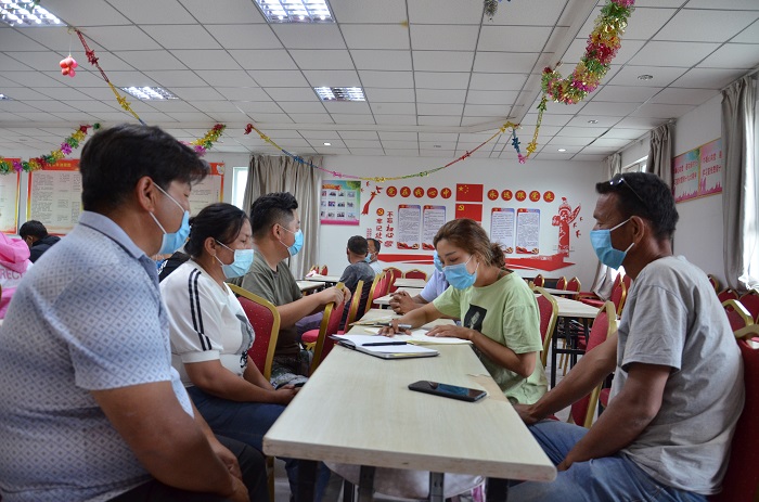 5月27日,尉犁县古勒巴格乡阿克其开村会议室里,村民代表分三个小组正在热火朝天地商议着慰问事宜。