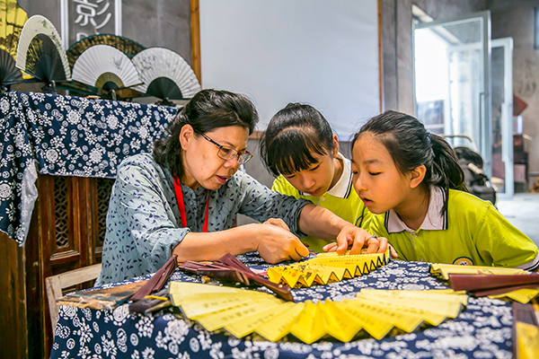 制扇技艺被列入浙江省首批非物质文化遗产保护名录。图为浙江省非遗代表性传承人周雅定正在向孩子们展示制作王星记扇。通过近距离了解手艺人如何巧手制扇,孩子们可以感受非物质文化遗产的独特魅力。(浙江省绍兴市柯桥区纪委区监委供 邓鹏军 摄)