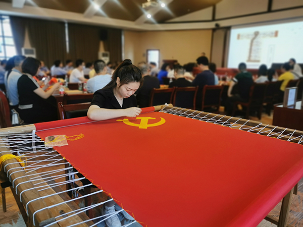有着两千多年历史的湘绣是中国四大名绣之一,被列入中国第一批非物质文化遗产保护项目名录。日前,湖南湘绣博物馆启动试运营,与长沙市芙蓉区韭菜园街道联合开展“走近非遗,共绣党旗”的活动。在体验区,首批参观者化身“绣娘”,一针一线体验非遗文化。(湖南省长沙市芙蓉区纪委监委供 张斯雅 摄)