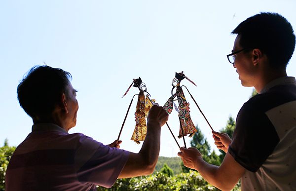 皮影戏,又称“影子戏”或“灯影戏”。在四川省剑阁县农家院里,皮影戏非遗传承人正在教授年轻人技艺,一边操纵影人,一边用当地流行的曲调讲述故事。(四川省剑阁县纪委供 武丕星 摄)