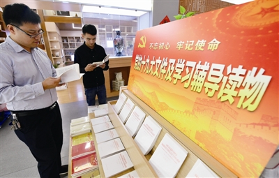 心中有信仰,奋斗有力量。党的十九大将习近平新时代中国特色社会主义思想写入党章,确立为党必须长期坚持的指导思想,为新时代伟大实践提供了行动指南。各地学而信、学而思、学而行,深入学习领会习近平新时代中国特色社会主义思想,武装头脑、指导实践、推动工作,以新气象新作为夺取新时代中国特色社会主义新胜利。图为10月30日,一读者在新华书店福州鳌峰坊书城阅览党的十九大文件及学习辅导读物